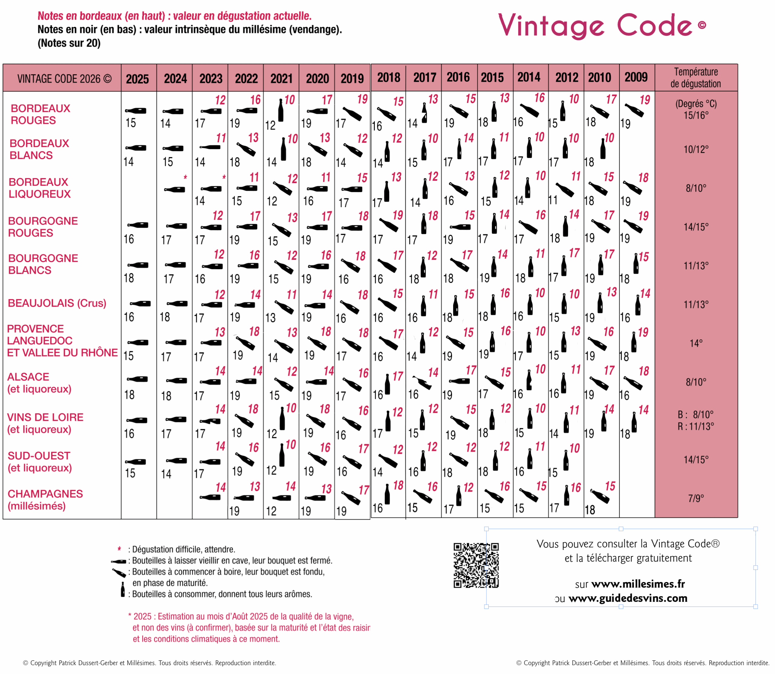 Prenons des exemples : à  Bordeaux, le millésime 2019 – noté 16 en valeur intrinsèque – est un grand millésime, et ce millésime commence à se goûter parfaitement. Dans la Vintage Code 2025, sa note est un 19 sur 20, qui signifie que ce millésime  procure actuellement beaucoup de plaisir même s’il possède un réel potentiel de garde. On peut donc commencer à le déguster.